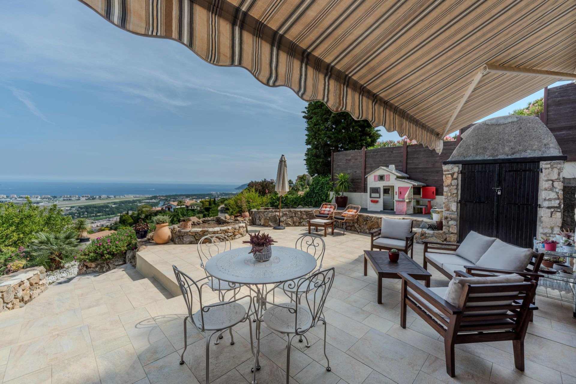 Sur les hauteurs de Mandelieu-La-Napoule avec vue panoramique mer et montagne. Entourée d'un jardin paysagé en restanques arboré de 1048 m². Beaucoup de charme pour cette maison de 170 m² composée de 3 niveaux : Le premier niveau est composé d'un garage, une buanderie aménageable en studio avec une entrée indépendante, une salle de douche avec WC, un vide sanitaire aménagé en cave. Le second niveau avec un accès de l'intérieur et de l'extérieur offre une entrée, un salon salle à manger avec une cheminée à insert, une cuisine aménagée et équipée, le tout donnant sur une terrasse de 70 m² permettant l'accès au jardin, trois grandes chambres, une salle de douche à l'italienne, WC indépendant. Le troisième niveau bénéficie de deux chambres, salle de douche à l'italienne, WC indépendant, une terrasse solarium, un grenier mansardé aménagé en bureau. En plus d'un garage de 24 m² avec portail électrique, vous profiterez de deux stationnements supplémentaires.